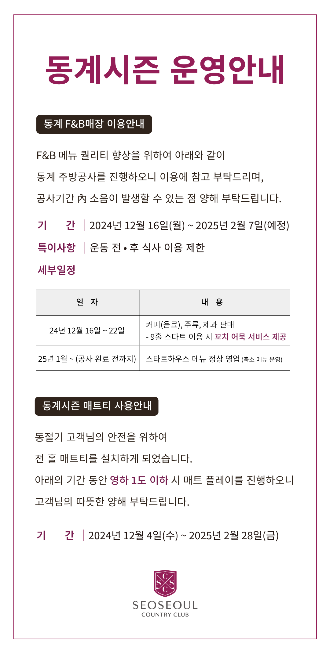 동계시즌 운영 안내
